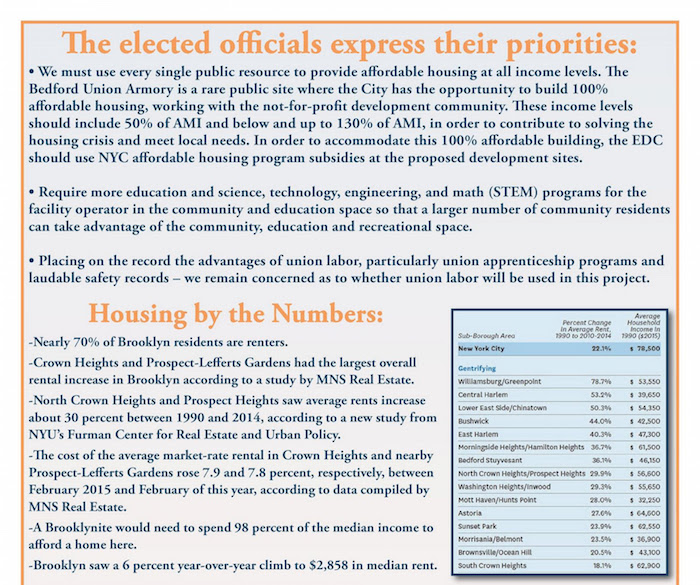 The City’s administration is developing the site through the Economic Development Corporation, whose stated vision is to create economic growth “fuelled by the City’s diverse people and businesses.” Crain’s and the EDC seem to agree on the need to maintain “diversity.” Ironically enough, on the same day that Crain’s published their article, DNAinfo reported on a Rent Café analysis that found Crown Heights is one of the neighborhoods that saw a large increase in wealthy renters. And last week, ProPublica issued a study of eviction data that showed that there are more evictions in zip code 11225 (the zip code of theBedford-Union Armory site) than nearly every other zip code in the City.