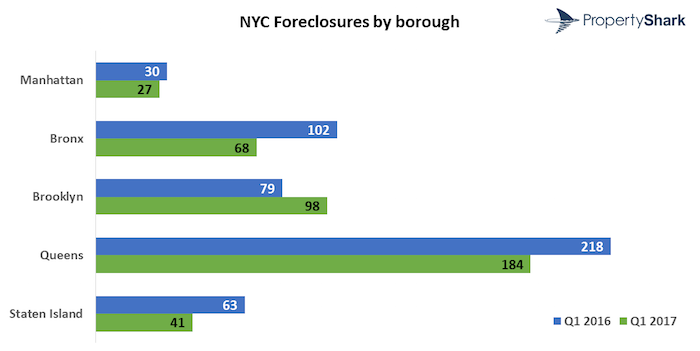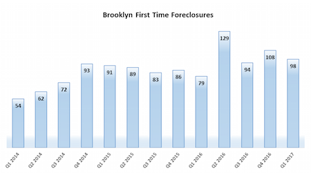 Zip code 11236, covering Canarsie, had a total of 21 foreclosures in Q1 2017 and is still Brooklyn’s area with highest foreclosure activity.