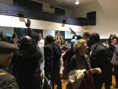 Right after the closing statements were delivered, the hall erupted into bedlam, with Eugene’s supporters standing up and chanting, “Primary!” and “Democrats!”, while Cunningham’s supporters tried to shout them down. Duane Joseph, one of the organizers for the event, tried to make some closing remarks, but was drowned out by the cacophony from both sides.