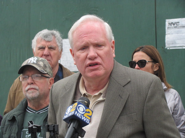 State Sen. Tony Avella (College Point, Whitestone, Bayside, Little Neck, Douglaston, Floral Park, Beechhurst, Malba and Auburndale) and Whitestone residents this stood at the corner of 14th Avenue and Totten Street to call on Mayor Bill de Blasio and the Department of Buildings (DOB) to investigate the status of a local property that has been “under construction” for over a decade.