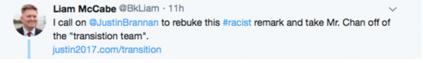 Former Republican candidate, Liam McCabe, a Facebook friend of the assemblymember, further highlighted the incident with his own Facebook and Twitter post calling on Brannan to remove Chan from his transition team.