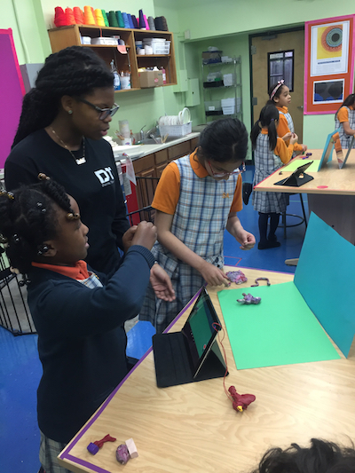 In the fall of 2016, SA Cobble Hill art teacher Sarah Mallory attended a three-week professional development program at the Brooklyn Museum. Naomi Barak, the digital arts coordinator at Digital Arts, an unscreened arts high school that serves mostly low-income students from Boerum Hill and Red Hook, was also attending the program. The two became friends, and, with Digital Arts cinema production teacher Carlos Rentas, came up with an idea: a teaching artist internship in Mallory’s SA third-grade class.