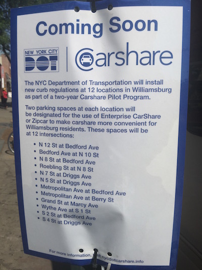 The parking spaces are part of a new de Blasio pilot program plan rolled out earlier this month, in which the car-share companies will take over 230 street parking (300 parking spaces total including municipal parking and public housing parking) throughout the city. Williamsburg will get the lion’s share or 26 of these spots.