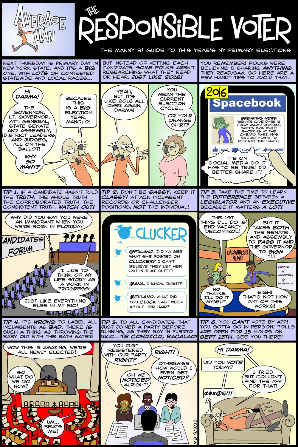 The strip features two special guest stars: Darma Diaz, a friend of 20 years and the 54th AD Democratic Female District Leader, and the East New York Chickens who, long time readers of Average Man know from the now-defunct urban chicken farm that was around the block from me for 5 years. The chickens have been a staple of Average Man from its earliest strips.