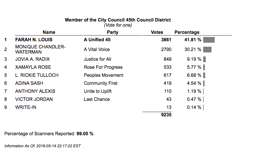 According to the unofficial votes from the NYC Board of Elections (NYC BOE), Louis won with 48.81% or 3,861 votes to easily best second-place finisher Monique Chandler-Waterman who had a respectable 30.21% or 2,790 vote. Jovia Radix finished with 9.19% or 849 votes, to round out the top three.
