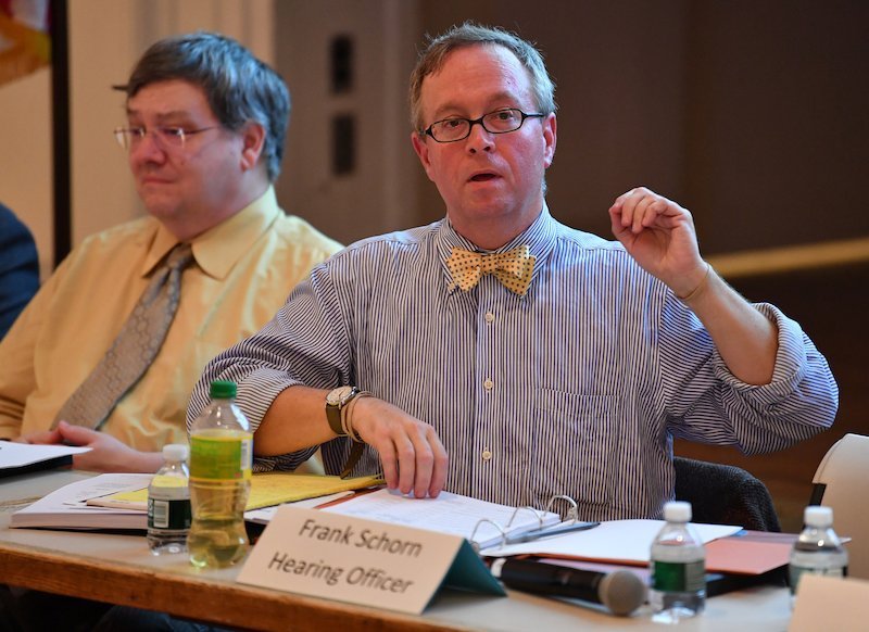 The hearing, led by hearing officer Frank Schorn, an EMT and attorney, kicked off with a debate between the two organizations lawyers over Ezras Nashim’s PowerPoint presentation.