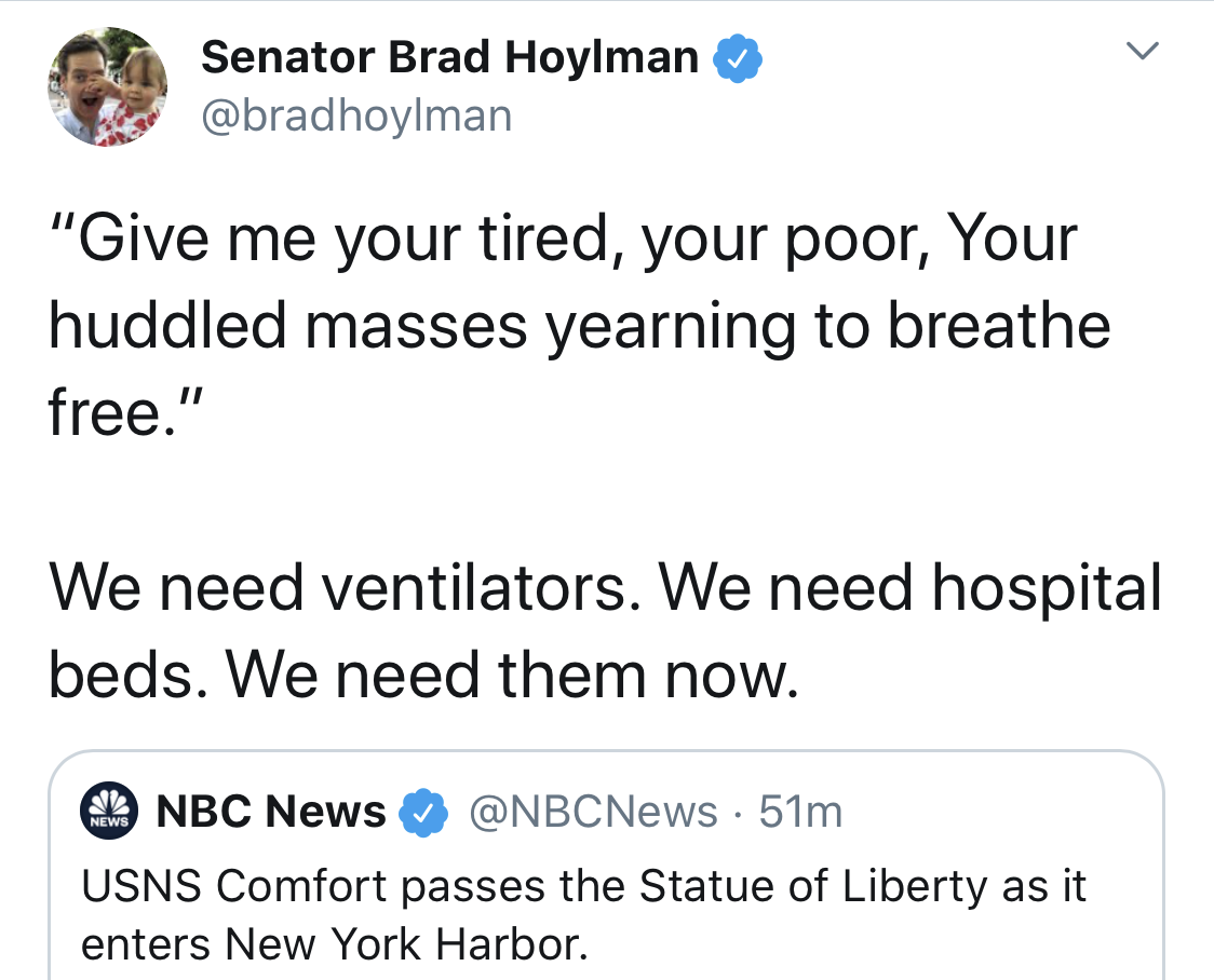 “’Give me your tired, your poor, Your huddled masses yearning to breathe free.’” Hoylman tweeted. “We need ventilators. We need hospital beds. We need them now.”