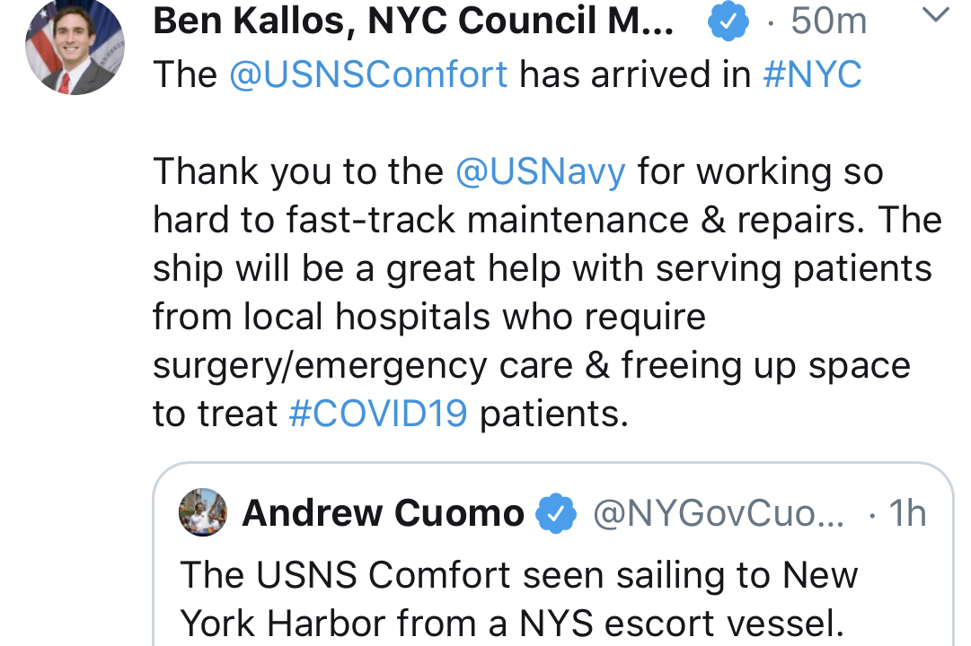 Councilmember Ben Kallos (D-Yorkville, Lenox Hill) expressed gratitude. “The @USNSComfort has arrived in #NYC,” he said as he retweeted Governor Andrew Cuomo’s (D) announcement.