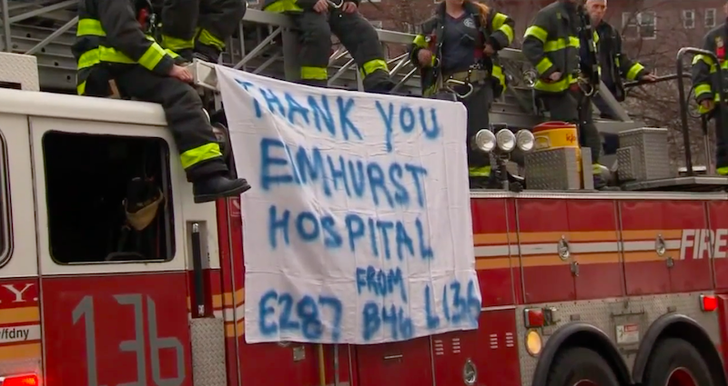 “Thank you Elmhurst Hospital from E287 B46 L136,” a sign draped over the side of one of the firetrucks read.