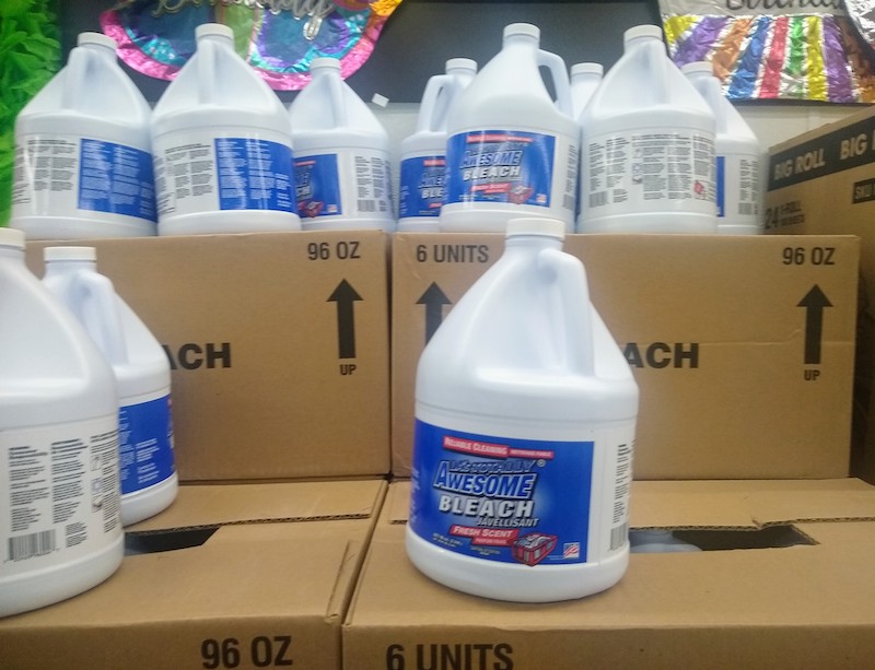 The Dollar Tree’s got bargain-based, off-brand cleaning products but at least they’re usually stocked. We’re at the point where we just buy the huge jugs of ammonia or bleach so we can gently mix it into the spray bottles and buckets with water at home. That’s for the surfaces. The vinegar’s to add to all the detergents for the towels, linens, and clothes.