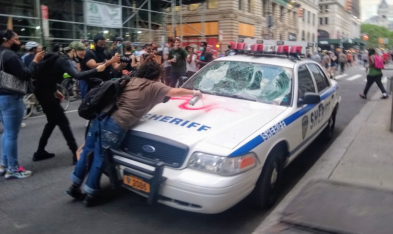 An abandoned sheriff’s car with the windows smashed in and curses spray-painted on the sides was visible on Court Street, where groups have roamed past daily with signs, chanting out loud and blocking buses or traffic. On Saturday, they walked briskly in a loop through the downtown district occasionally stopping to stand in the streets or sit on the steps of borough hall with police cars following at moments. At one point they gathered en masse outside of the Brooklyn Detention Center, where a brick was thrown at the lobby window.