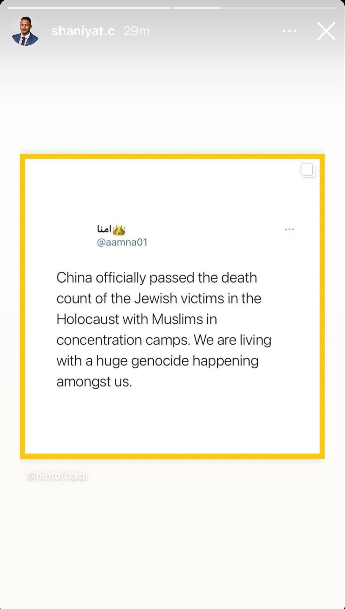 “China officially passed the death count of the Jewish victims in the Holocaust with Muslims in concentration camp,” the graphic read. “We are living with a huge genocide happening amongst us.”