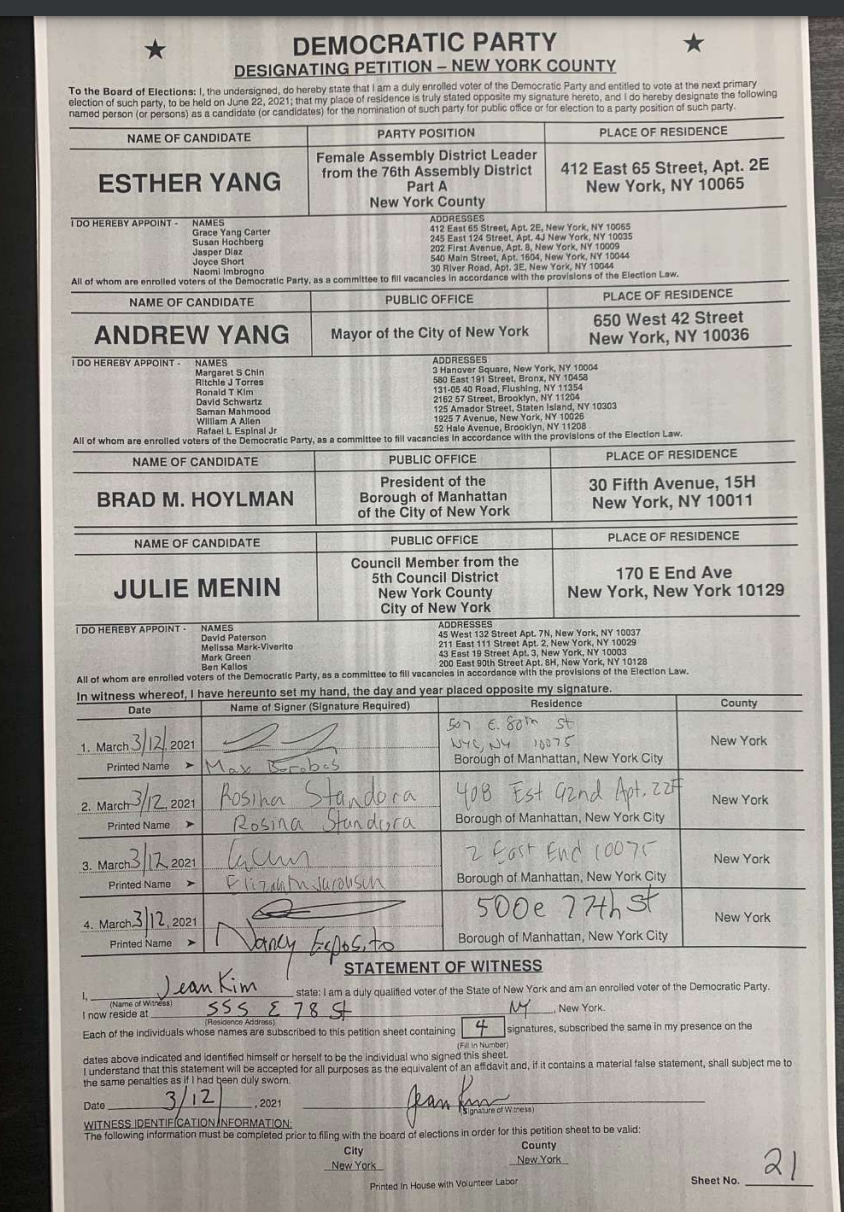 The petitions signed and filed by Kim with the BOE were for a slate of candidates including the two Yangs, who are not related, Manhattan Borough President candidate Brad Hoylman and City Council candidate Julie Menin.
