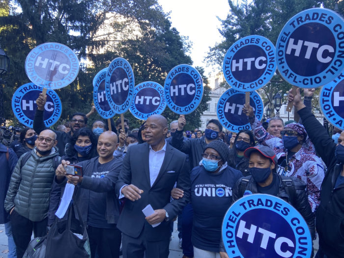 The unions present at the fountain in front of City Hall were ready for their “labor mayor,” as he called it. Kyle Bragg, president of SEIU 32BJ, said that Adam’s union and police work history proves he will institute police accountability as mayor. “We’re fighting for justice and respect for Black and brown lives and Black and brown communities, and get real police accountability. Eric’s the man who will make that happen,” Bragg said.