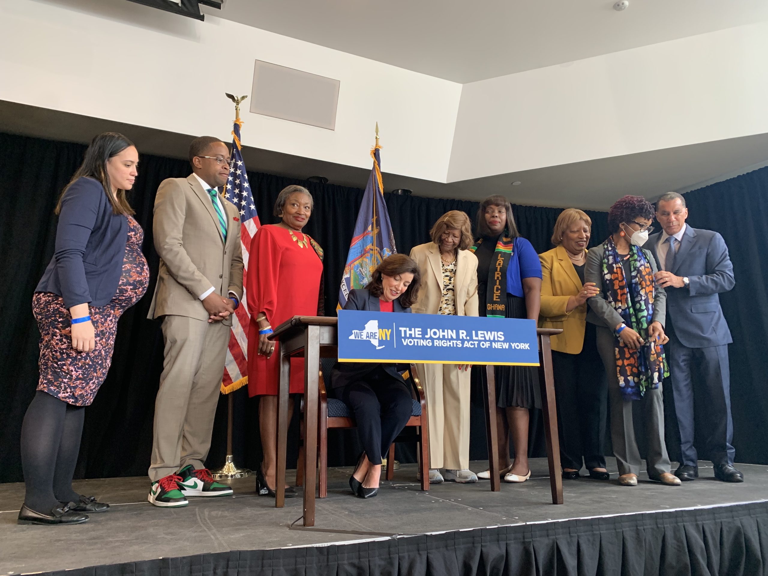 Just in time for Juneteenth, Governor Kathy Hochul gathered with several lawmakers at CUNY’s Medgar Evers College Monday to sign the John R. Lewis Voting Rights Act of New York into law.